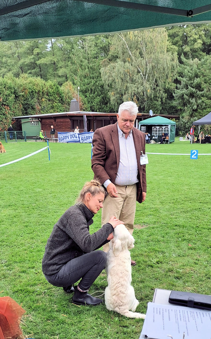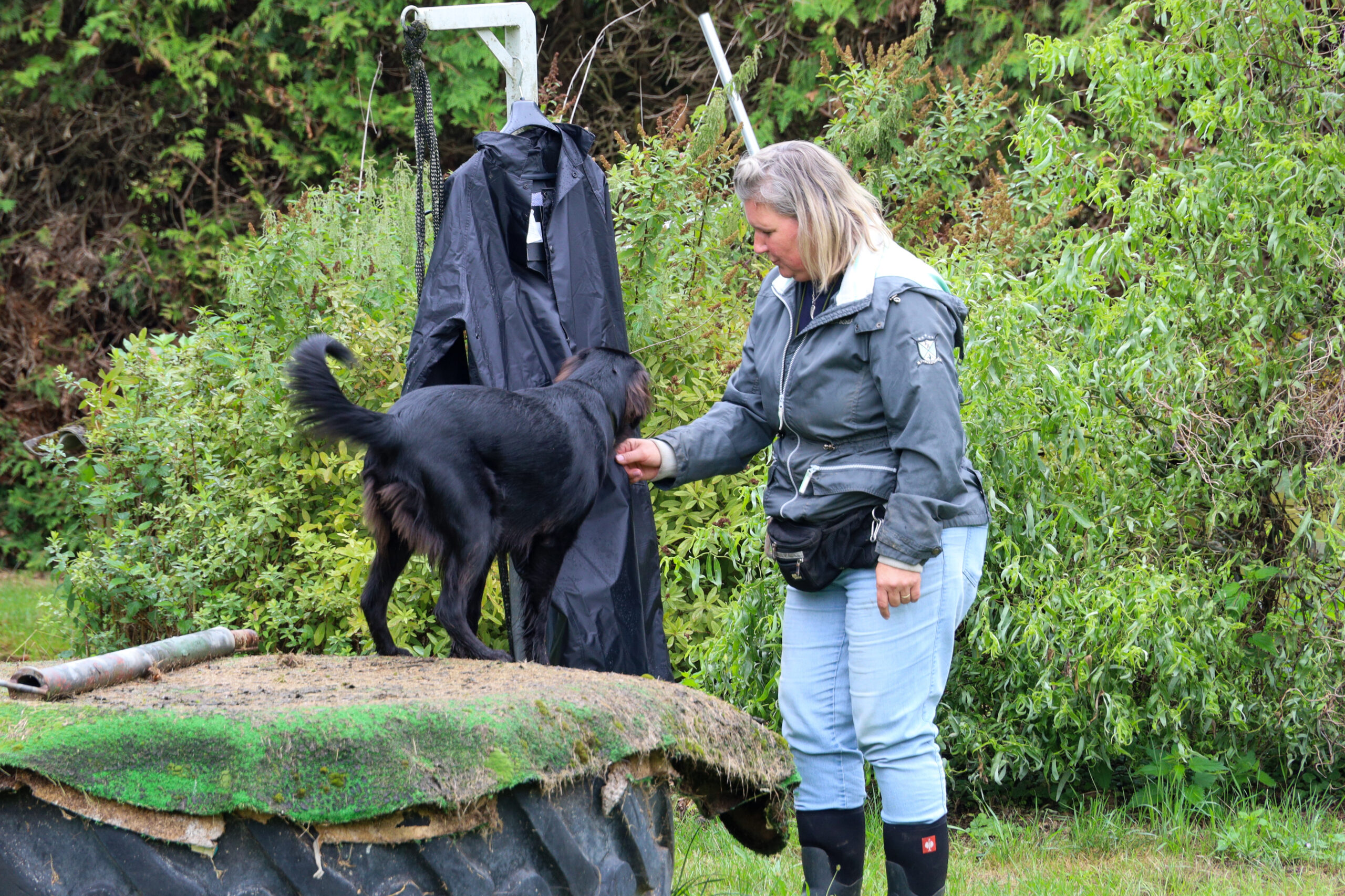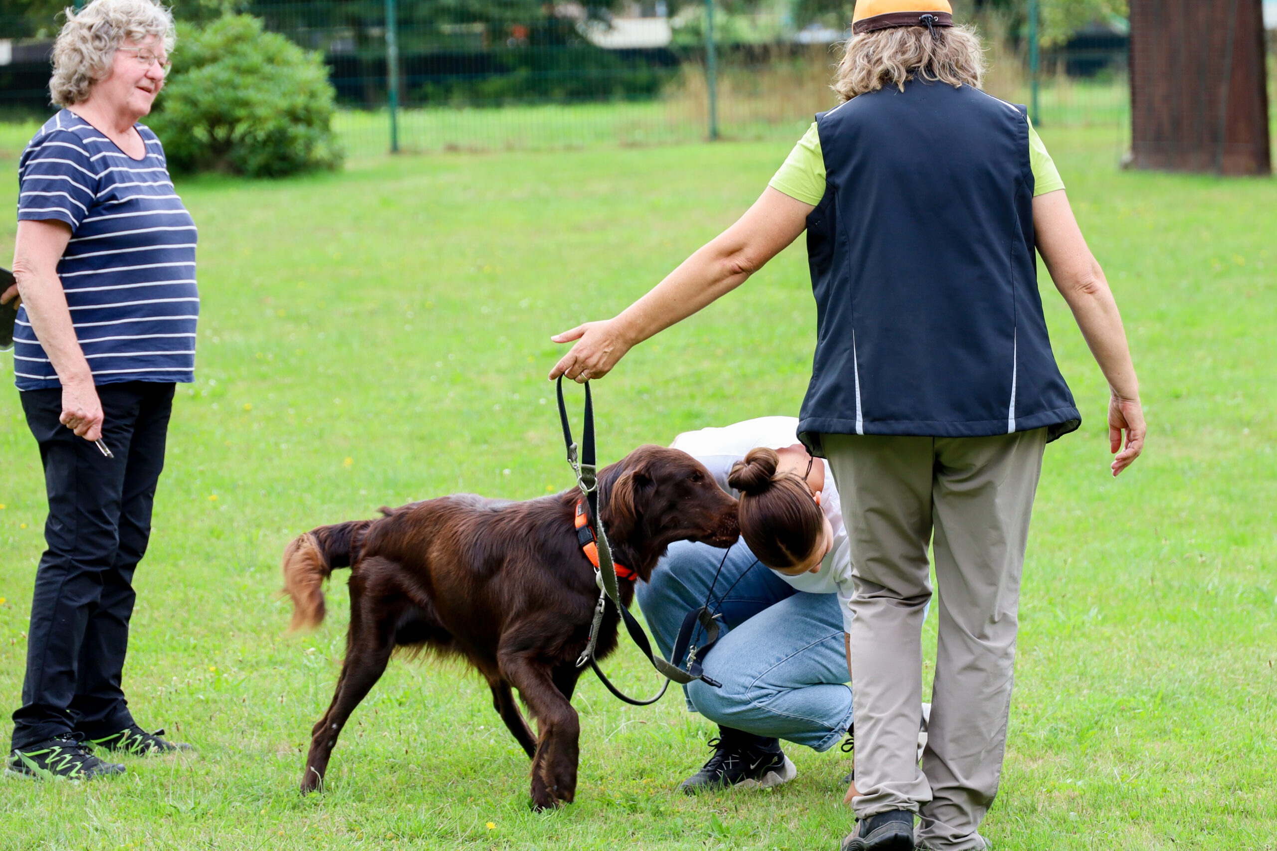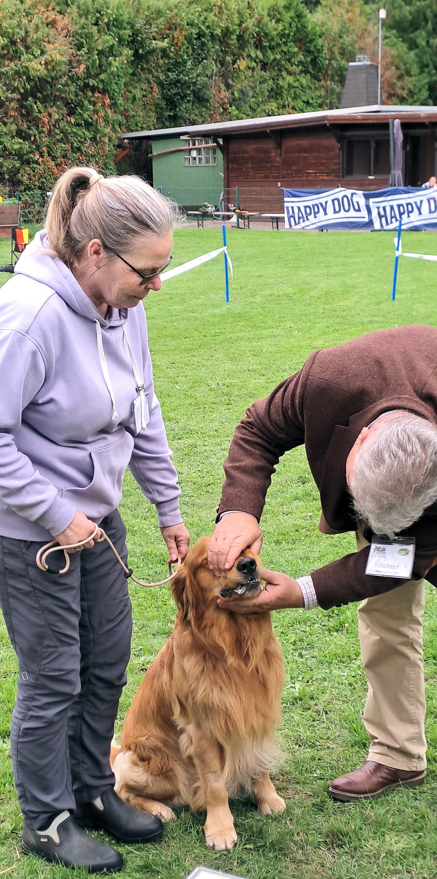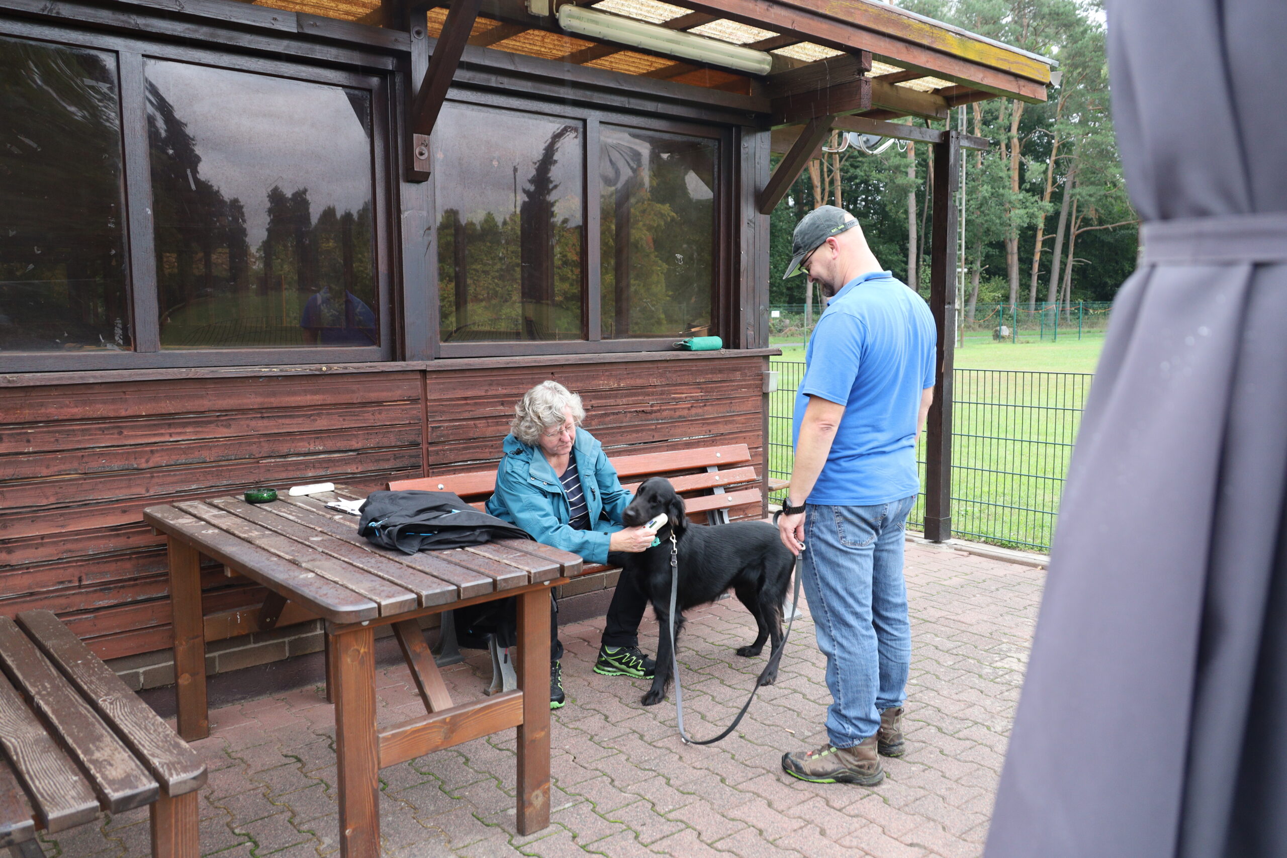Dann betrat Achim Behringer, unser Prüfer, den Platz. Schon nach wenigen Worten mit seiner lockeren, freundlichen Art und dem trockenen Hundehumor war klar – dieser Mann weiß nicht nur, wo vorne und hinten am Hund ist, sondern auch, wie man Menschen beruhigt, denen die Aufregung ins Gesicht geschrieben steht.