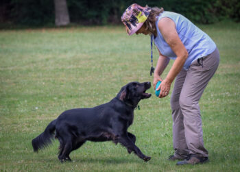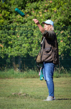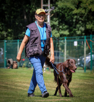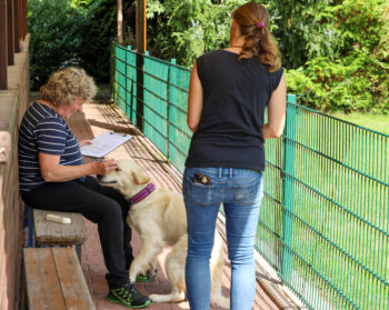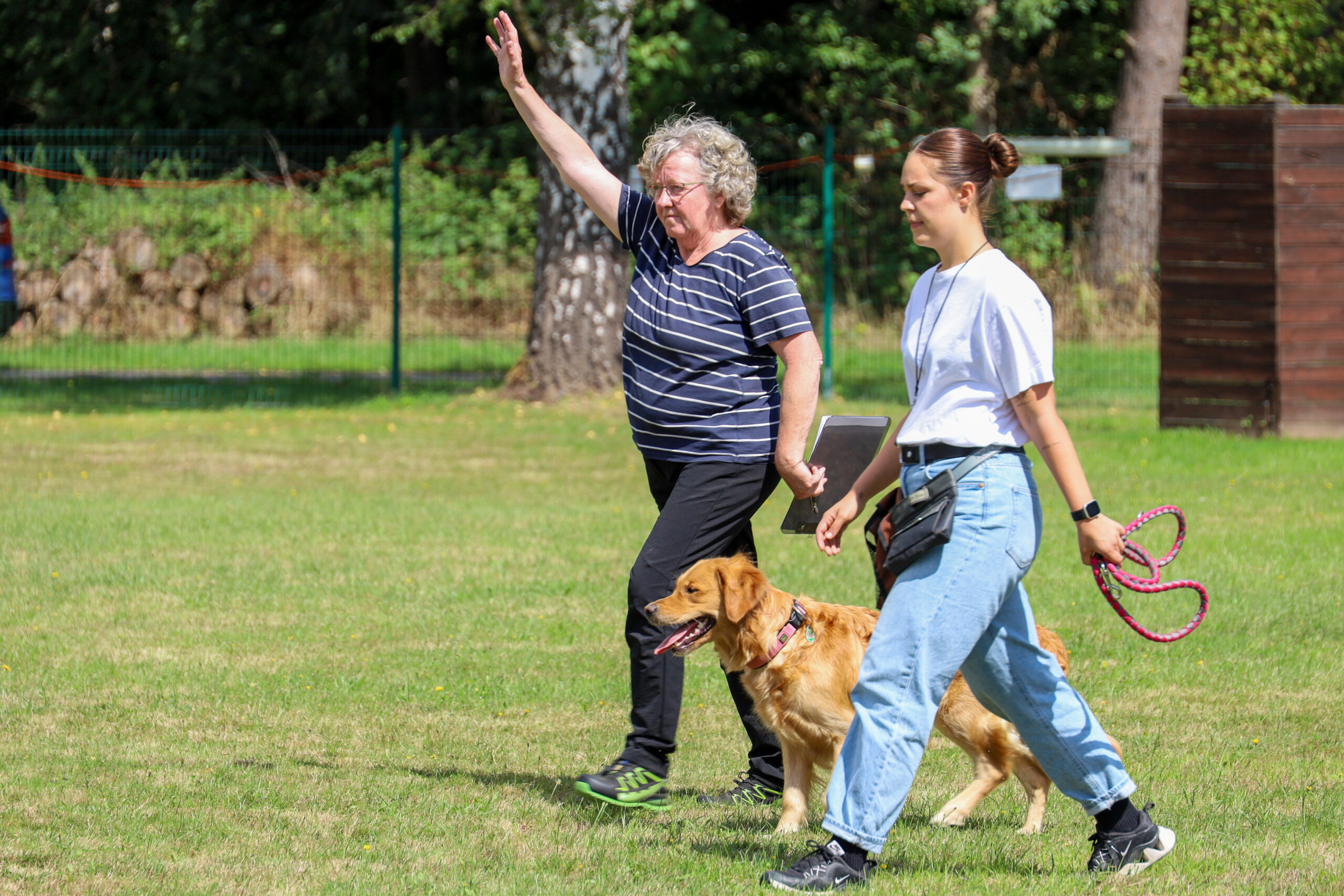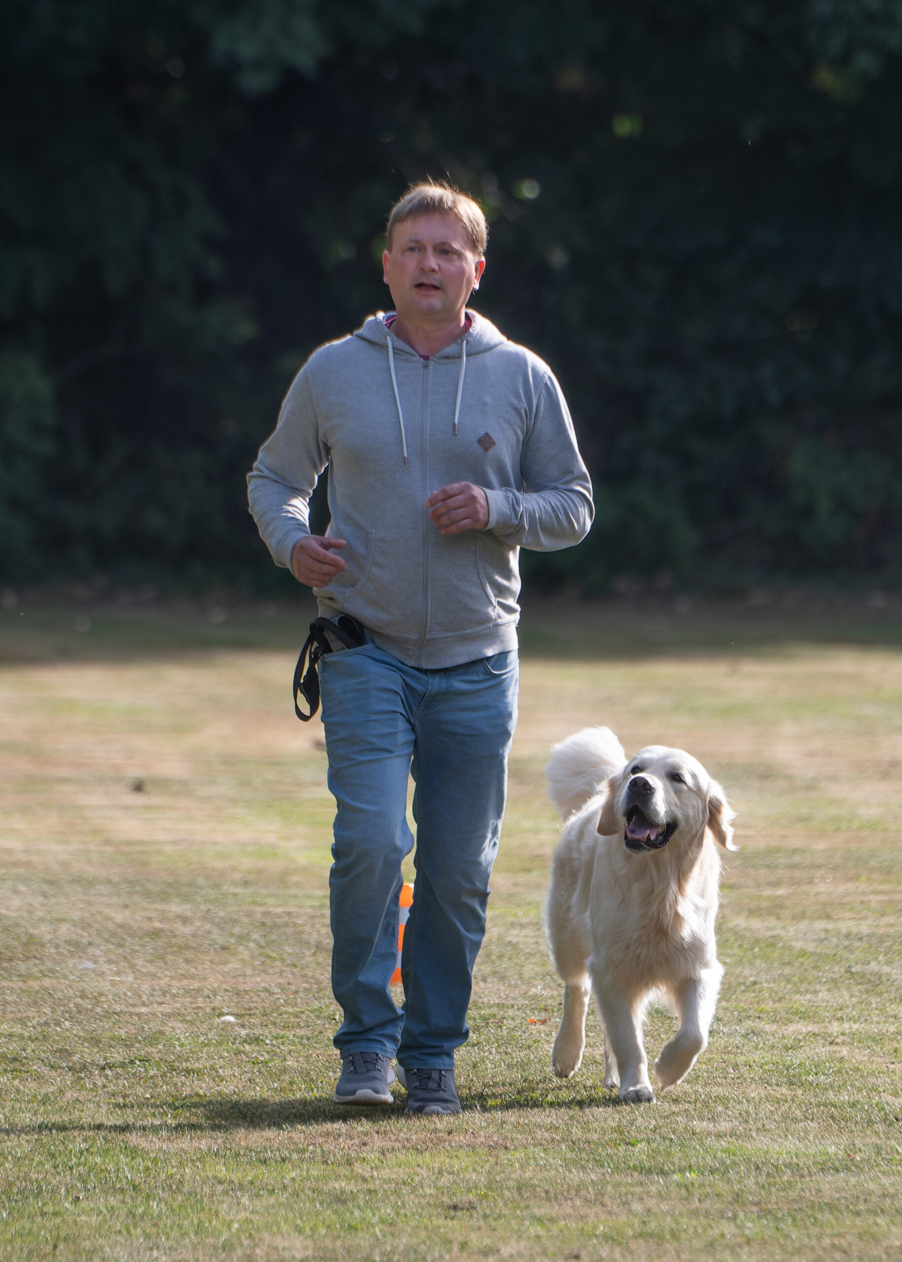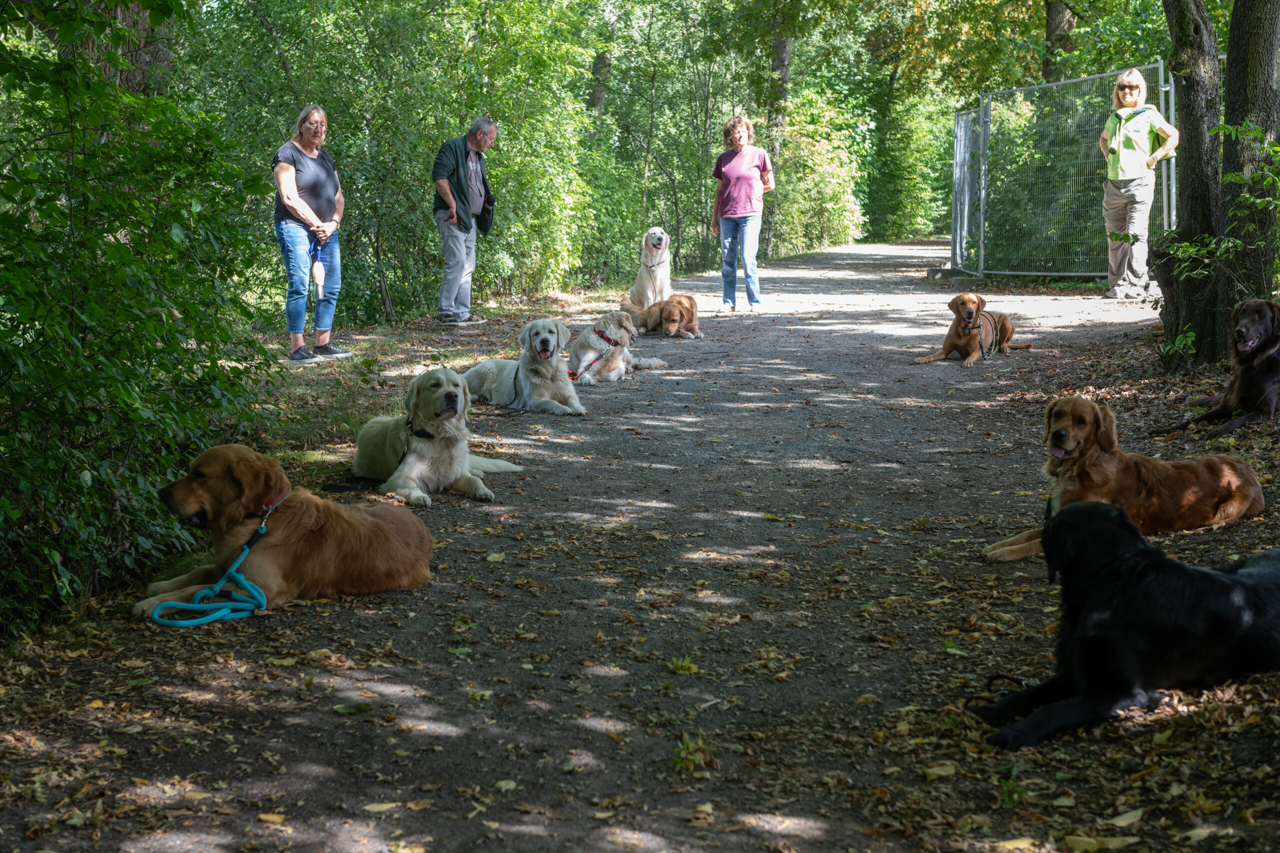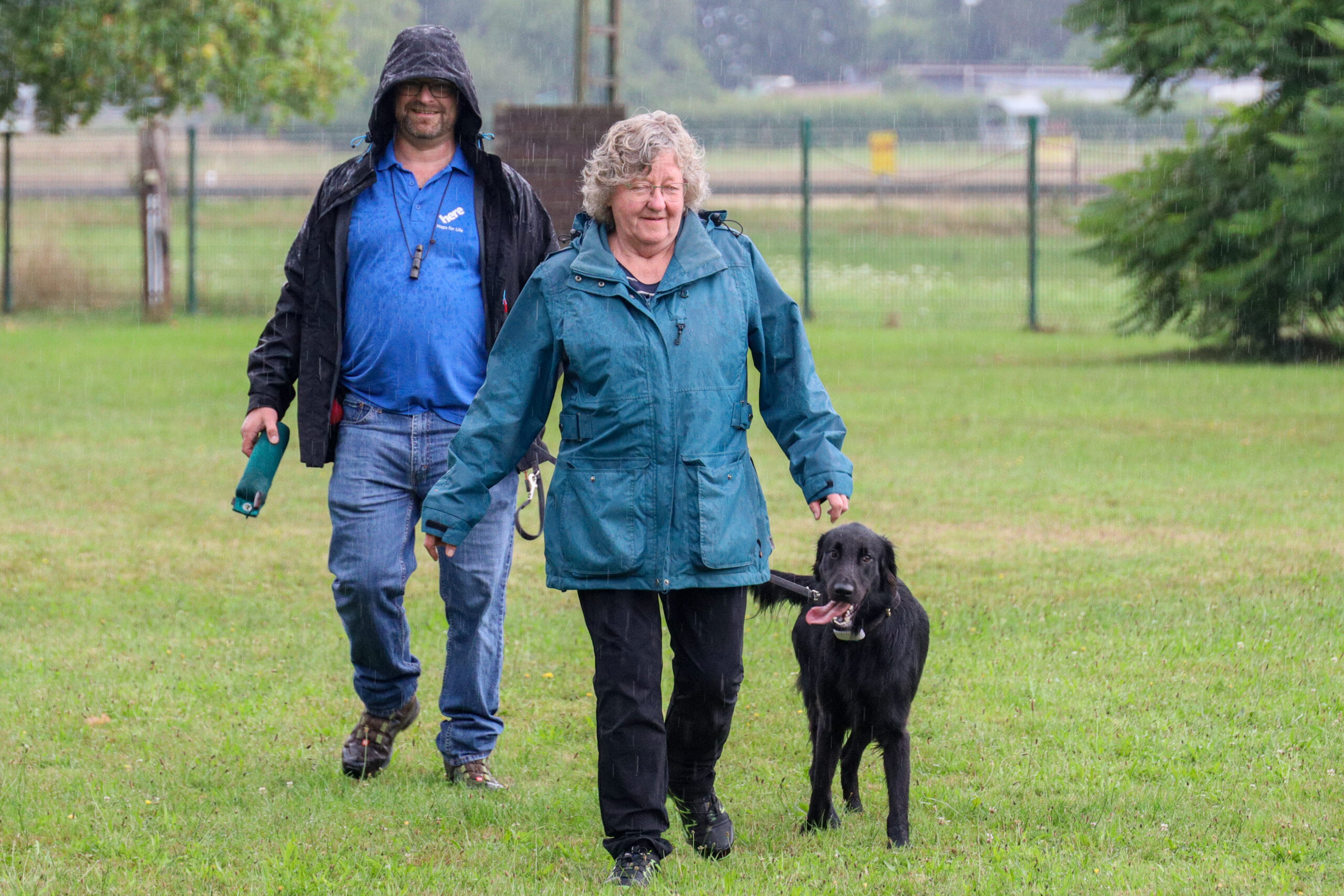 Dann betrat Achim Behringer, unser Prüfer, den Platz. Schon nach wenigen Worten mit seiner lockeren, freundlichen Art und dem trockenen Hundehumor war klar – dieser Mann weiß nicht nur, wo vorne und hinten am Hund ist, sondern auch, wie man Menschen beruhigt, denen die Aufregung ins Gesicht geschrieben steht.